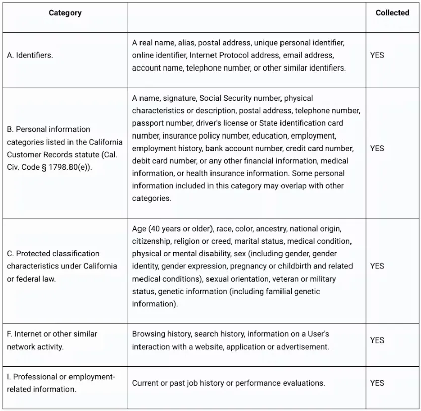 We collect information that identifies, relates to, describes, references, is capable of being associated with, or could reasonably be linked, directly or indirectly, with a particular User or device (“personal information”). In particular, we have collected the following categories of personal information from Users within the last twelve (12) months: